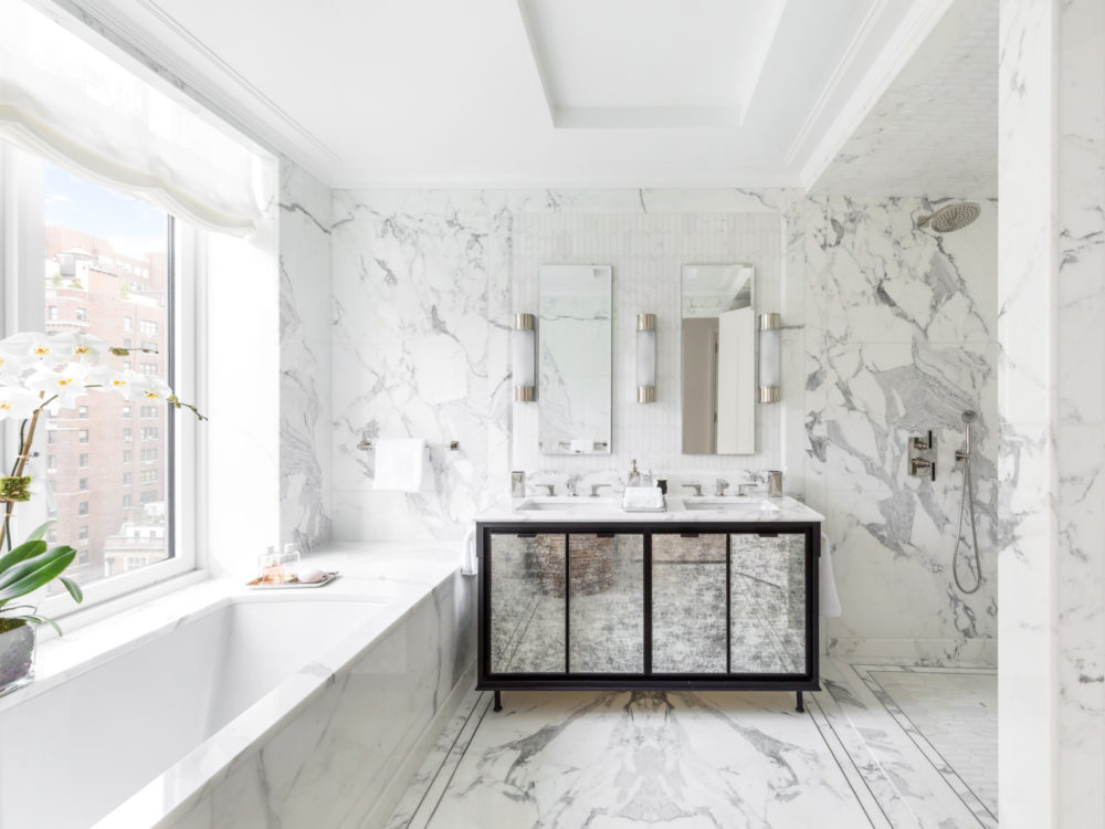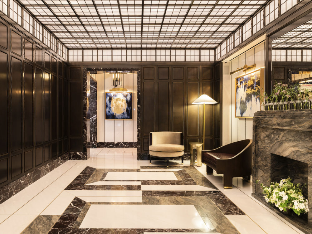 David Collins Studio designed the 11 residences, as well as the three floors of amenities, with art deco-inspired details and rich wood, hand-laid marble, and bronze accents. “It was important to us to create a timeless design, rich in ambiance and quality,” said Simon Rawlings, the London-based studio’s Creative Director. “Interiors that exist in the past, present, and future.” The nine full-floor residences and two duplex homes are palatial by any standards—the smallest residence is 3,881 square feet; the largest is 7,888 square feet with a 1,613-square-foot terrace overlooking the neighboring church—and have customizable kitchens by Smallbone of Devizes, spa-like bathrooms, and thoughtful touches like Versailles parquet floors.
