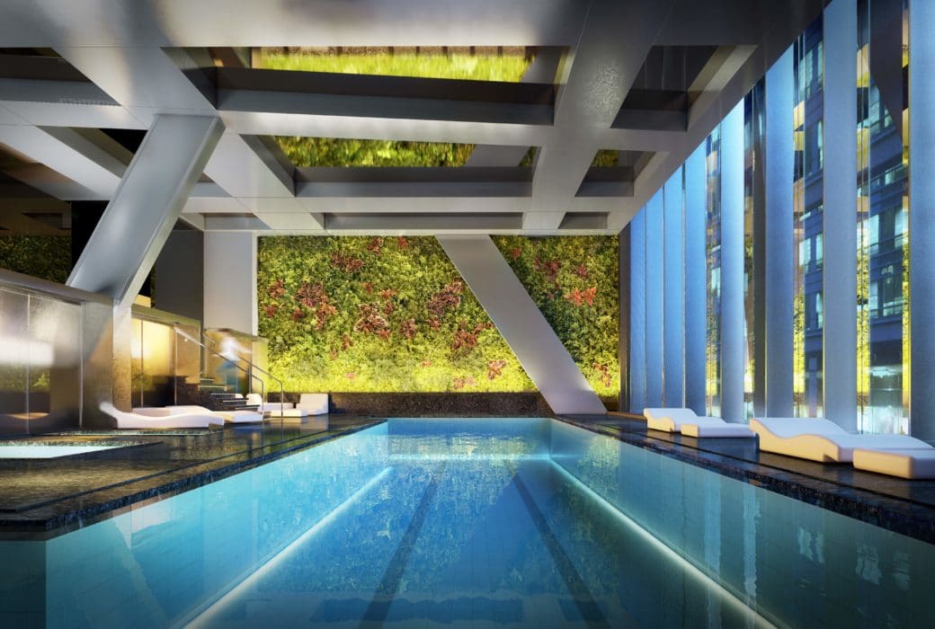 Thoughtful amenity spaces designed by Workshop/APD offer everything residents need—24-hour doorman and concierge service, a state-of-the-art fitness center, a children’s playroom, and storage galore—and then some. Of note are the indoor saltwater pool, the outdoor sports court, and a lush private courtyard that connects the two lobbies and features a living wall, birch tree arbor, and boxwood garden.