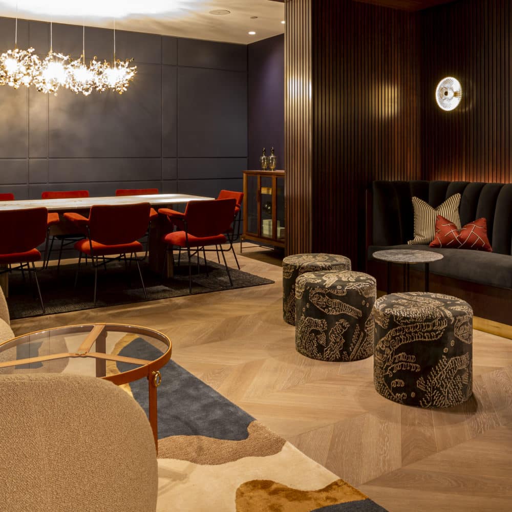 Echoing nearby garden squares like Fitzroy Square Gardens, 101 on Cleveland boasts its own private terrace landscaped with planters and hanging eggs chairs where residents can appreciate the urban views, including the iconic BT Tower. Inside, the amenities are comprehensive, encompassing a gym and wellness suite, a business suite, a midcentury-inspired private bar, and a velvet-seated screening room.