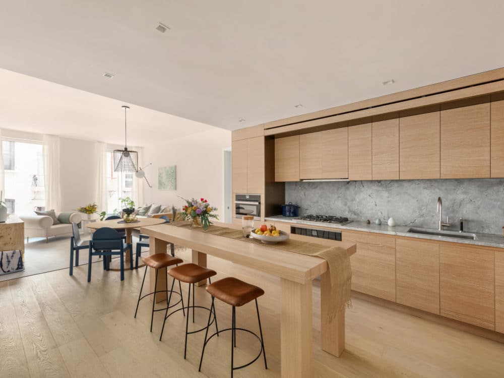 Designed by DXA studio, this 21-story tower manages to feel innovative and bold while still matching the energy and overall aesthetic of its central Chelsea location. At first glance, the white-faceted facade appears uniform; look closer, and you’ll notice that there are discrete setbacks, with glass Juliet balconies, and lush landscaping that nods to Chelsea’s famous flower markets. Oversized windows get even more oversized on higher floors, and painted metallic inlays reflect the sunlight, giving Maverick a sense of dynamism throughout the day.