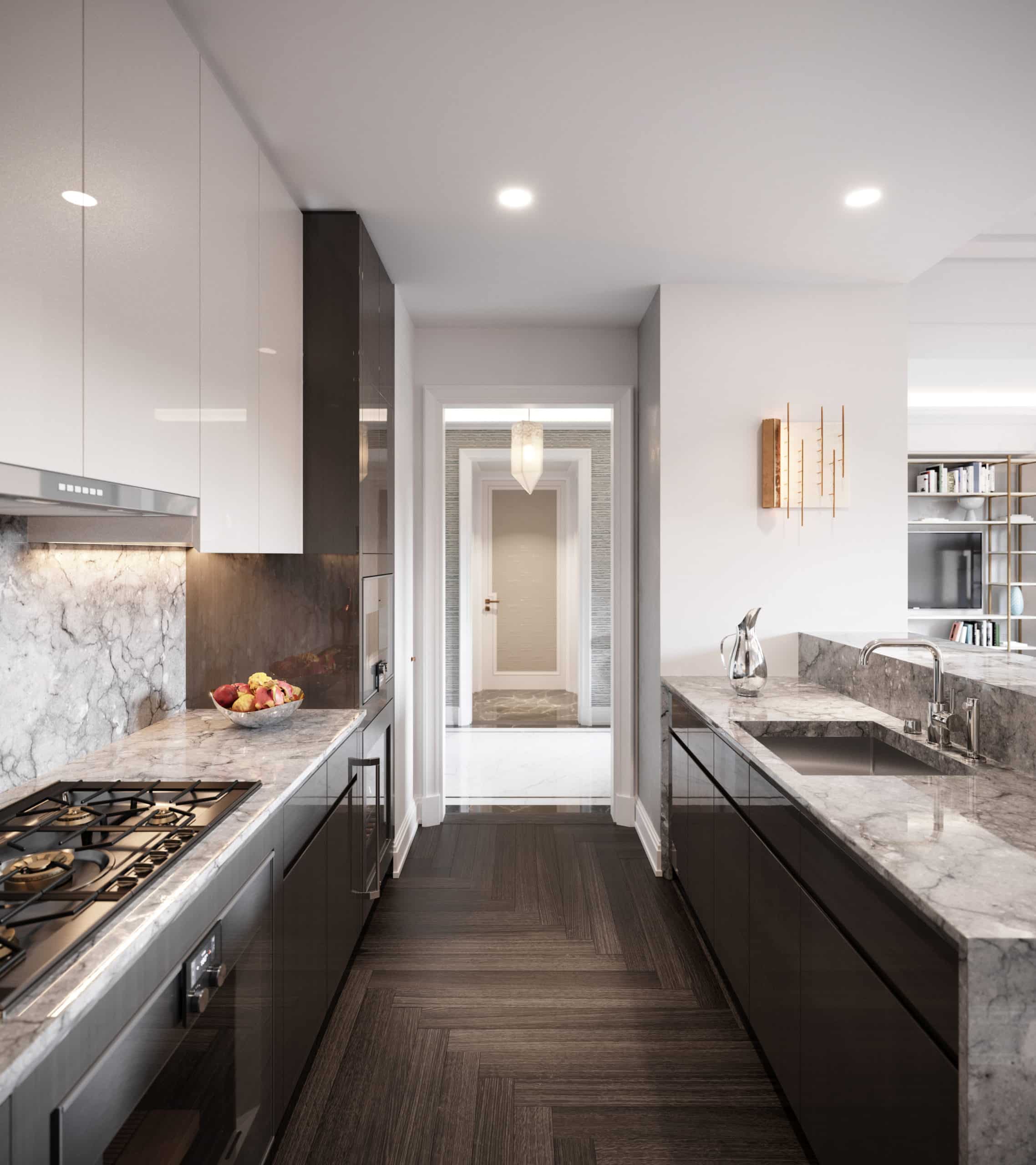 The open kitchen is defined by a peninsula with a bar-height counter and the main living area at over 25-feet in length, has spacious art walls and easily accommodates both a dining table for six and a luxurious seating group. Bespoke details throughout include cove moldings, solid interior doors, drapery and shade pockets and 4” cerused white-oak herringbone floors.