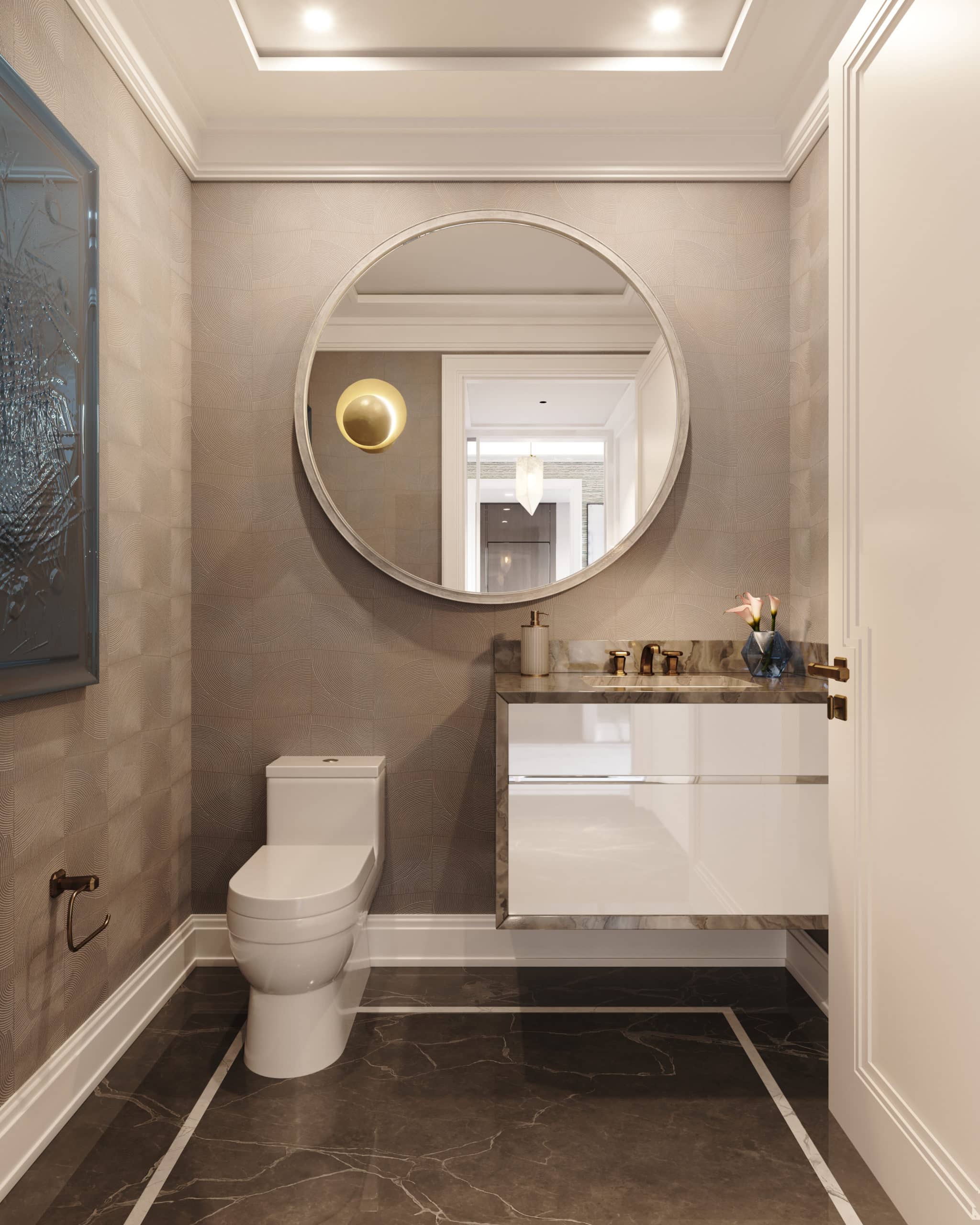 The sense of arrival is celebrated by a grand foyer with marble floors with brass inlays and cove ceiling. A formal powder room features a marble vanity with antique bronze fixtures.
